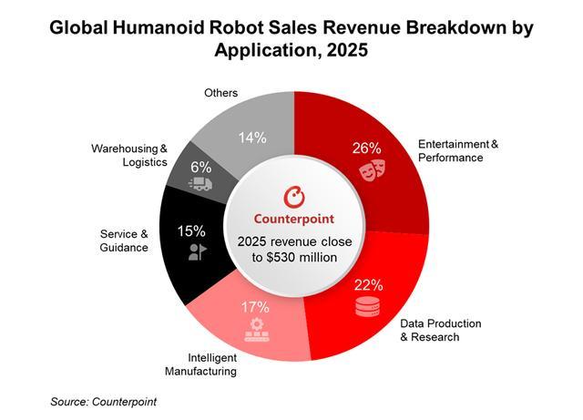 在2025年,人形机器人应用已经呈现出多元化趋势,文娱商演、数据采集、工业智造、导览导购、物流仓储是当前、也会是未来一两年人形机器人的主要落地场景。Counterpoint的数据显示,2025年,上述领域分别贡献了全球人形机器人销售额的26%、22%、17%、15%、6%。