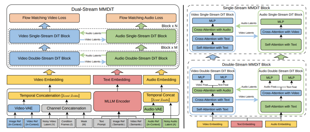 为了实现音画同步,模型在每个 Transformer 块中都嵌入了双向跨注意力(Cross-Attention)机制,确保音频特征能够感知视觉动态,反之亦然 。