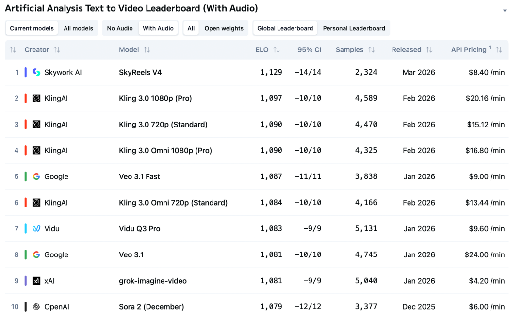 Artificial Analysis 是目前业内最具公信力的 AI 模型评测平台之一,其视频榜单采用公开竞技场机制,由全球真实用户进行盲测对比,通过大量 Elo 积分制两两比较计算排名,更能反映模型在真实场景中的综合表现。