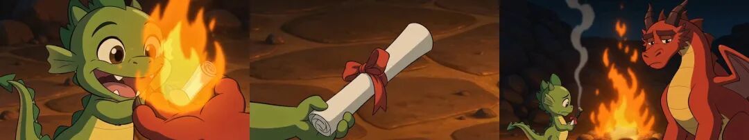 多帧图参考。Prompt:视频开始于一只绿色幼龙和红色火龙在篝火旁对话。随后镜头切换至 @图片 - 1,绿色幼龙从红色火龙手中递过一份证书;随后镜头切换至 @图片 - 2,绿色幼龙喷出火焰烧毁了证书;最后镜头切换至 @图片 - 33,绿色幼龙和红色火龙露出沮丧的表情。